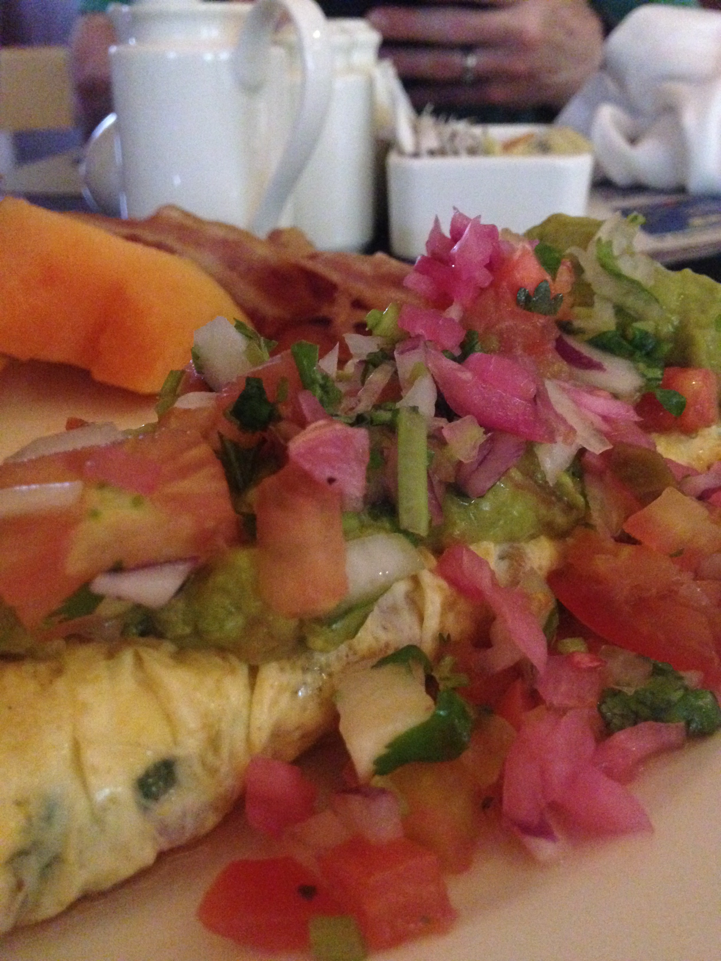 My typical breakfast on vacation; a veggie omelette under a mountain of guacamole and salsa