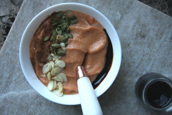 • Pour into a bowl and add your favorite toppers. Pictured is pumpkin seeds, almond slivers, molasses, and extra cinnamon. Hemp seeds, plain yogurt, or any other nuts and seeds would also be complimentary!