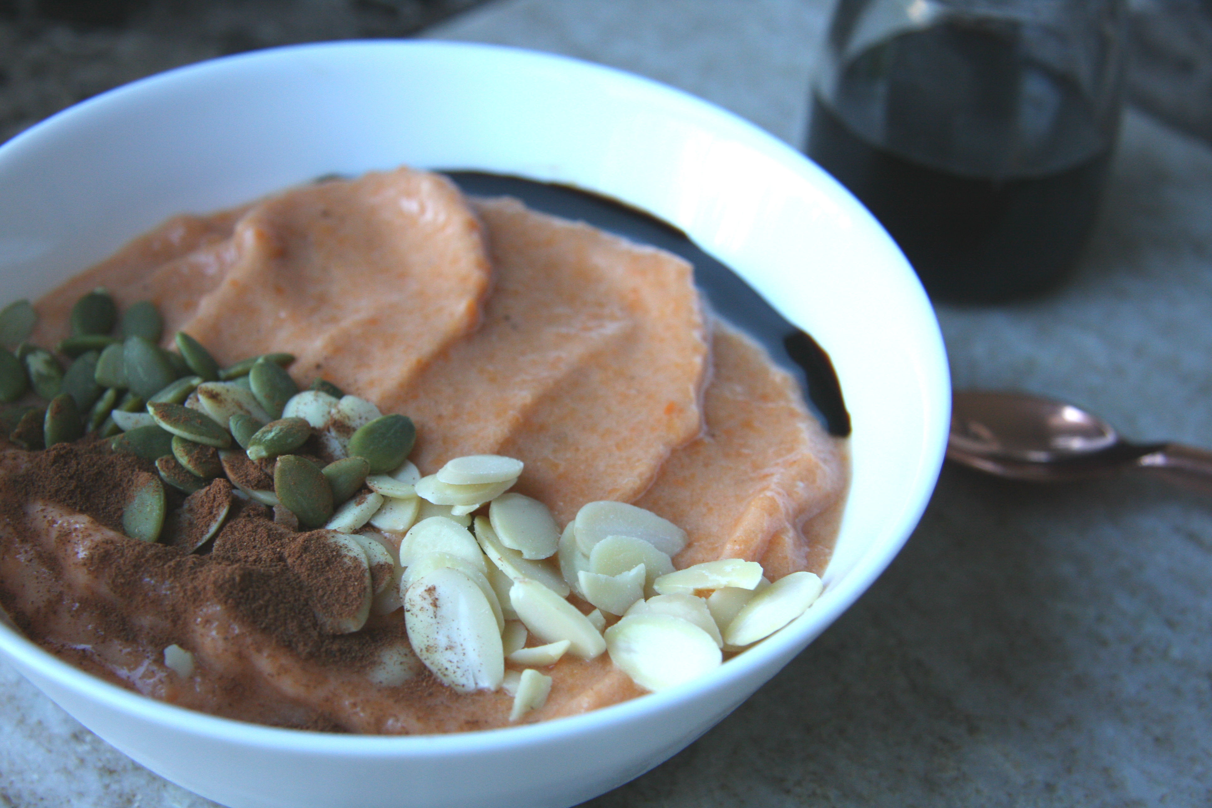 This smoothie bowl is so tasty and is also totally fitting for the fall season. The complex carbohydrates provide sustained energy for busy mornings.