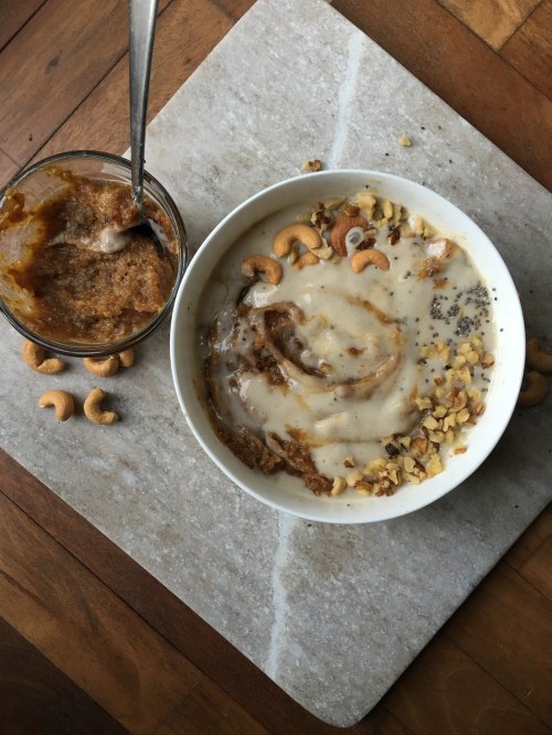 Swirl a big scoop of the salted caramel into the Nicecream; top with cashews, walnuts, and chia seeds.