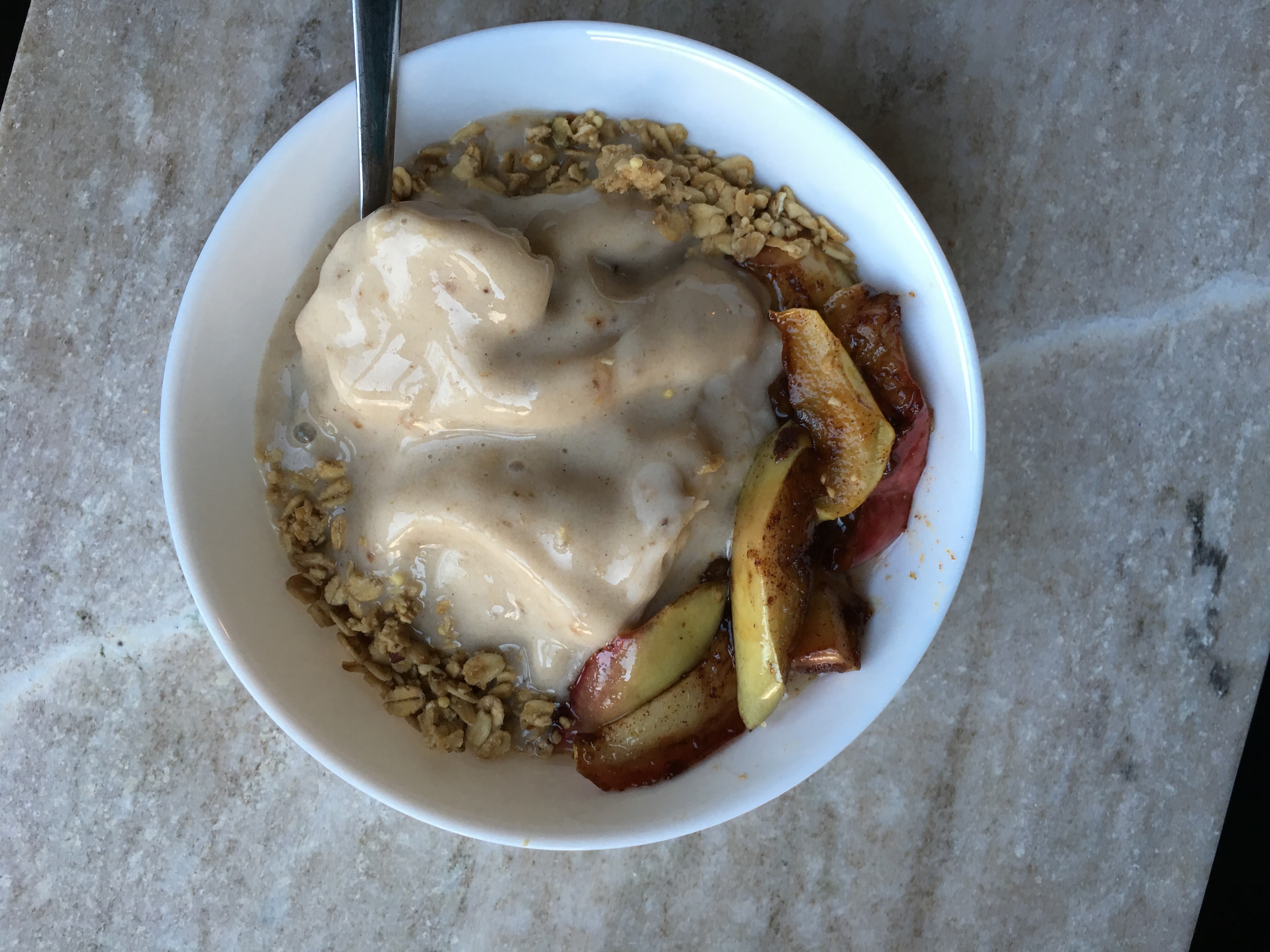 Blend bananas, almond milk, and remaining 1/2 tsp of cinnamon. Scoop into a bowl and top with warm apple slices and granola.