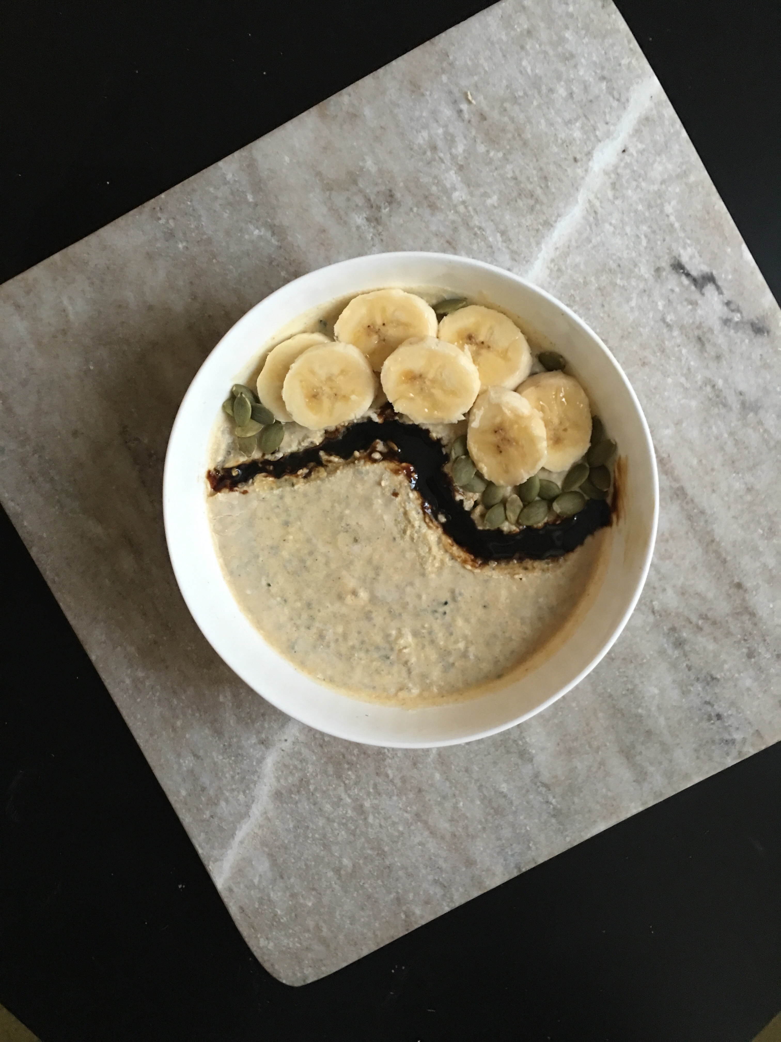 In the morning you should find most of the liquid has been absorbed by the oats, chia seeds, and hemp seeds. Separate into two bowls. Use half a banana on top of each bowl. Add 1 TBSP molasses and 1 TBSP pumpkin seeds to the top of each bowl.