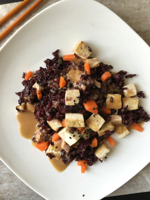 Tofu, dark rice, fermented carrots, and sesame seeds