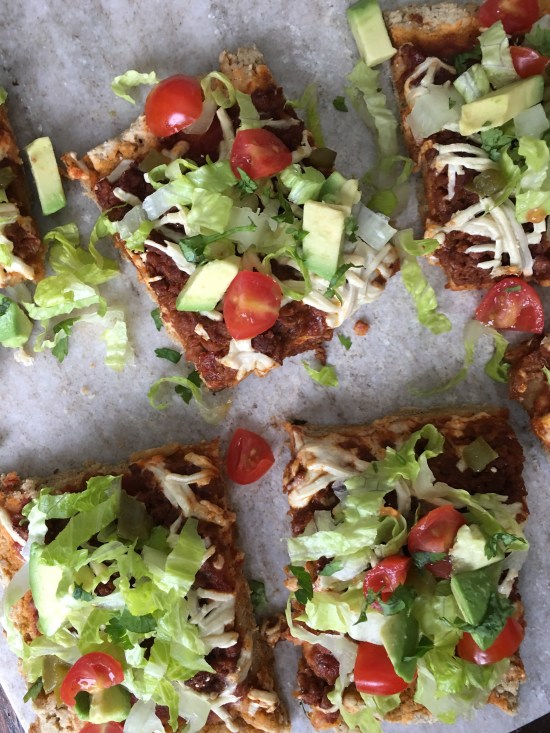 Once the dough is ready, knead and press out into a rectangular shape. Top the pizza with salsa, yves mexican ground round, and daiya cheese. Bake in the oven for 20-25 minutes. A good way to tell when this is done is when crust begins to brown.