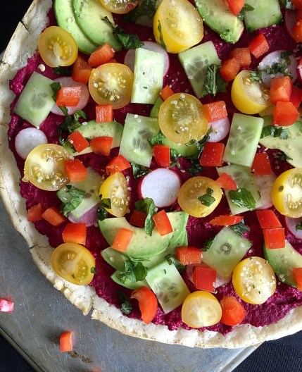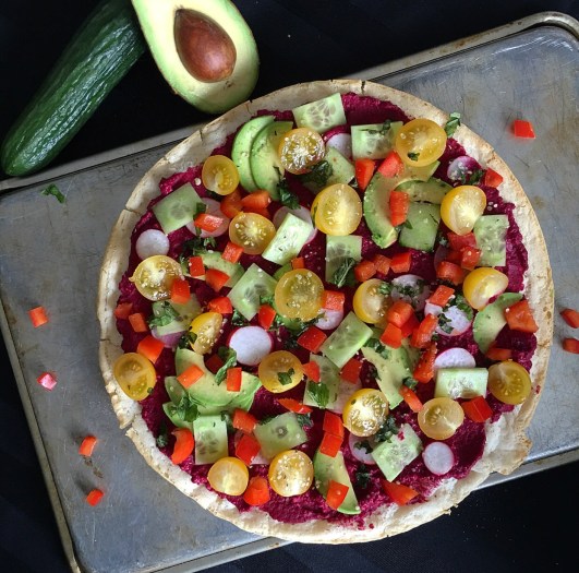 Putting up a recipe for this is almost silly, as it is so so simple. But in keeping with tradition, I will add it below. Honestly, feel free to add whatever raw veggies you enjoy, on whatever crust you enjoy. The focus here is bright colors in variety.