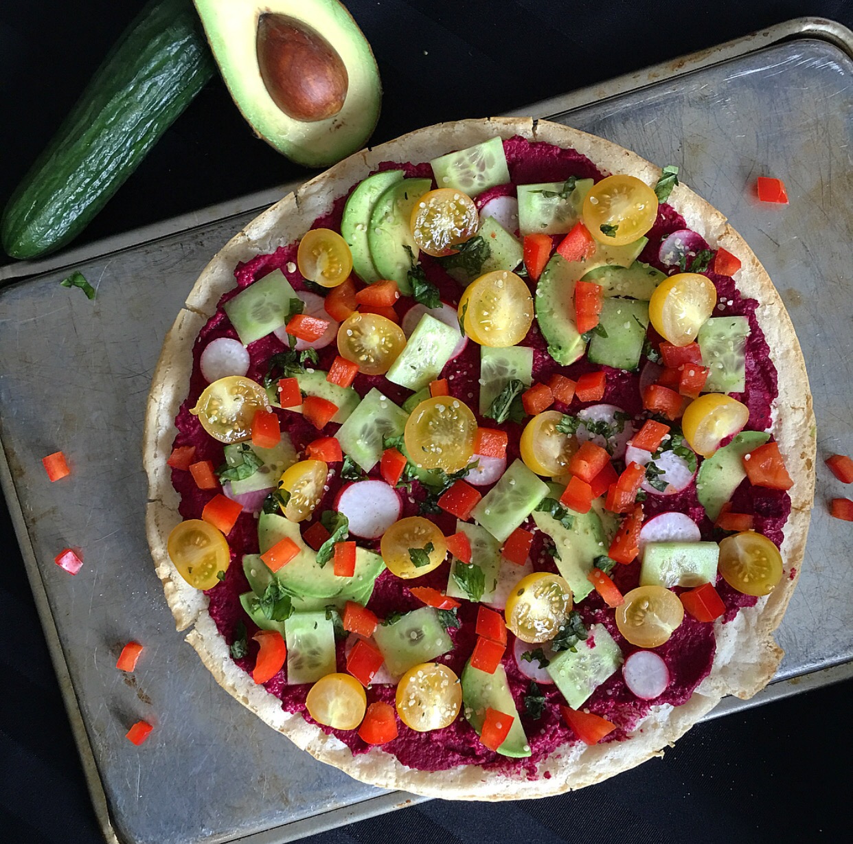 Once the crust is cooked, spread the beet hummus over it. Layer raw vegetables on top, and finishing with a sprinkle of salt, pepper, and hemp seeds.