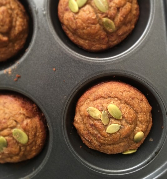 In a non-stick or lined muffin tray, distribute muffin batter evenly. Top each muffin with a few pumpkin seeds. Bake in the oven for 30 mins.