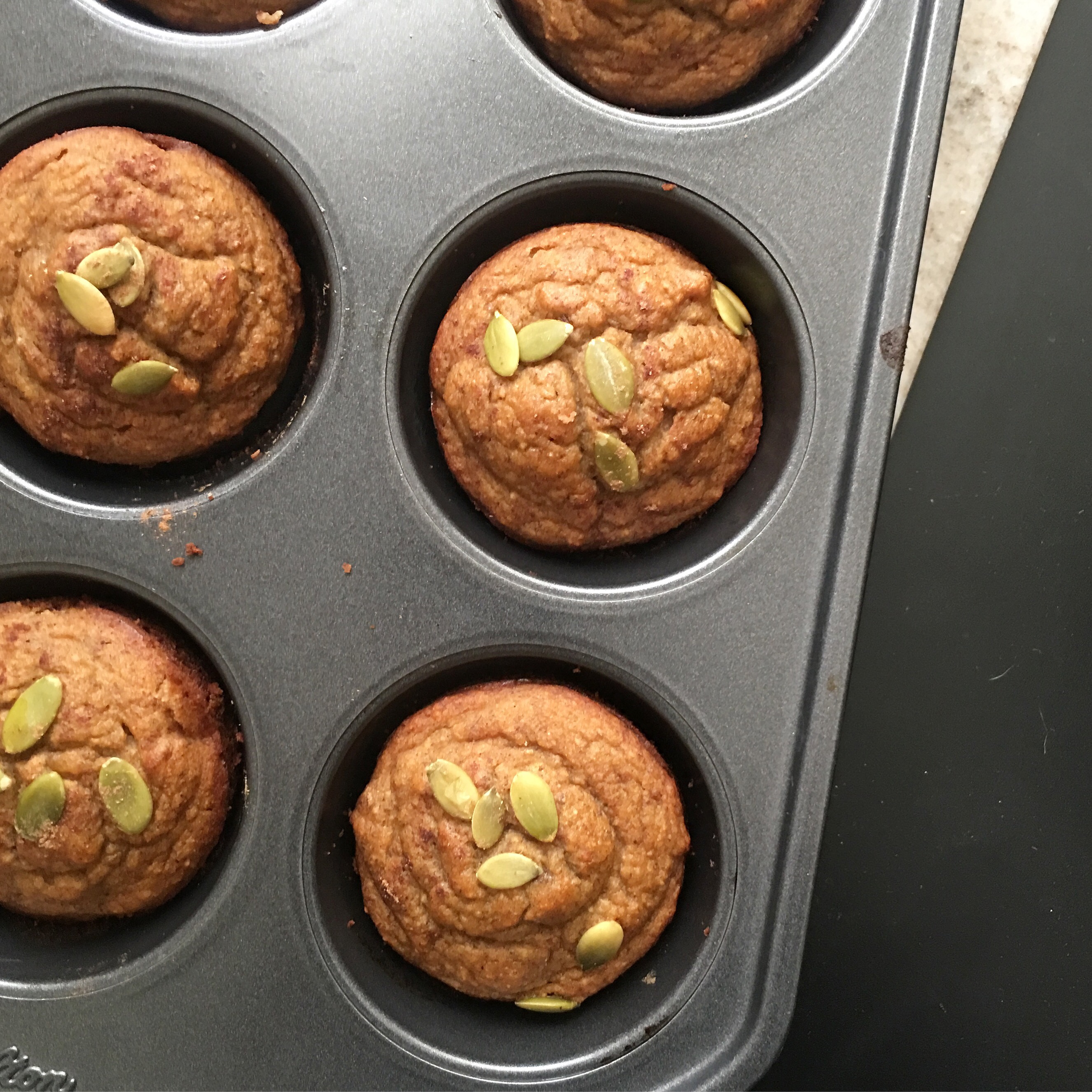 In a non-stick or lined muffin tray, distribute muffin batter evenly. Top each muffin with a few pumpkin seeds. Bake in the oven for 30 mins.