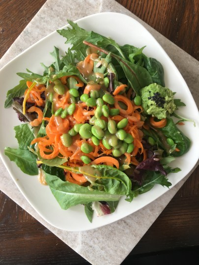 Directions: Combine all dressing ingredients in a small bowl. Prepare your salad by mixing all ingredients together in a large bowl. If your edamame is frozen, give them a warm water bath until they defrost. This should only take about 5 minutes. I mashed my avocado, but feel free to simply dice and add in. Top with the Ginger Tahini dressing and enjoy!