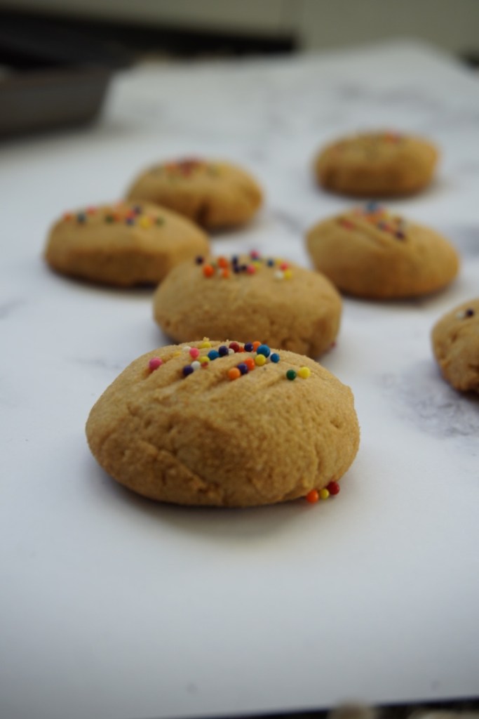 Lastly, add some sprinkles on top. This step is optional, but it does add some fun to these cookies! Put your tray in the oven and bake for 15 minutes, or until the cookies are lightly golden.